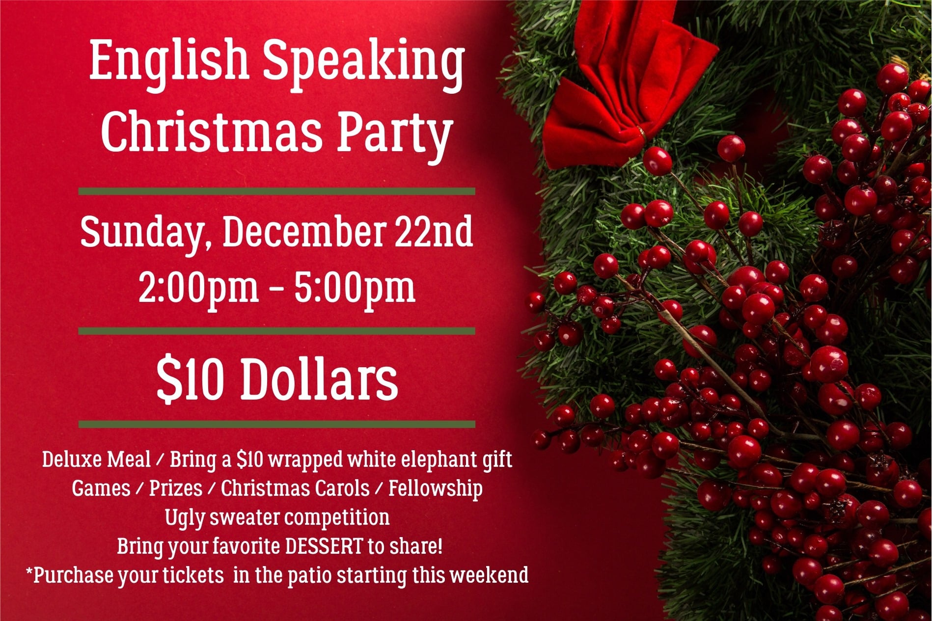 Unfortunately, we have had to cancel the party because of the government’s increasing restrictions due to COVID. A refund will be available when the church re-opens.